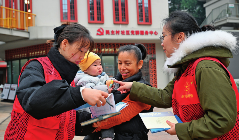 重庆市九龙坡区谢家湾街道民主村社区工作人员陈春林(左一)、廖睿(右一)向辖区群众讲解城乡居民基本医疗保险政策。