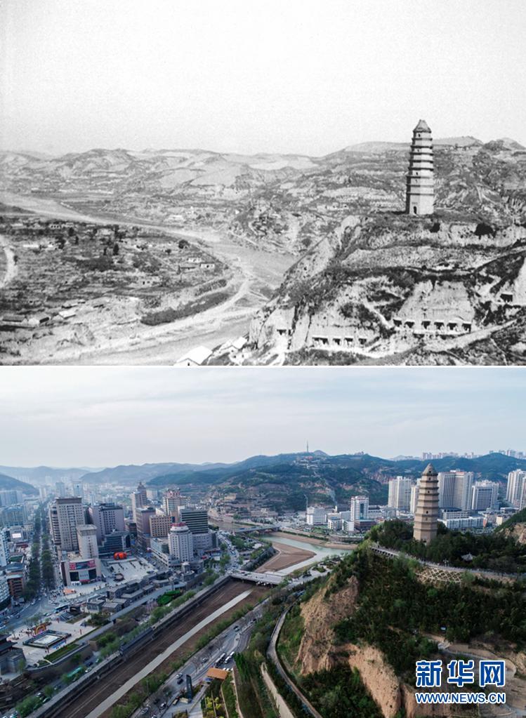 拼版照片:上图是1938年拍摄的延安(资料照片),下图是2021年4月22日拍摄的延安市。