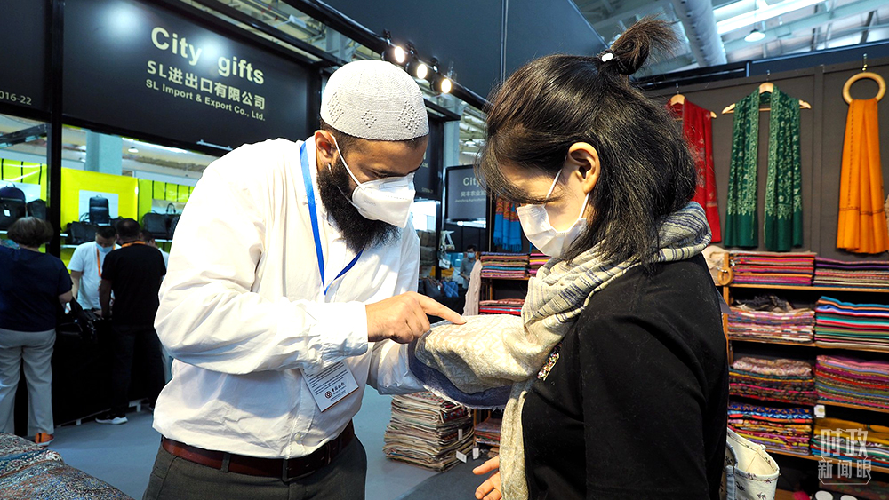 △2021年9月3日,2021中国服贸会首钢园展区,来自印度的商家为顾客介绍本国商品。
