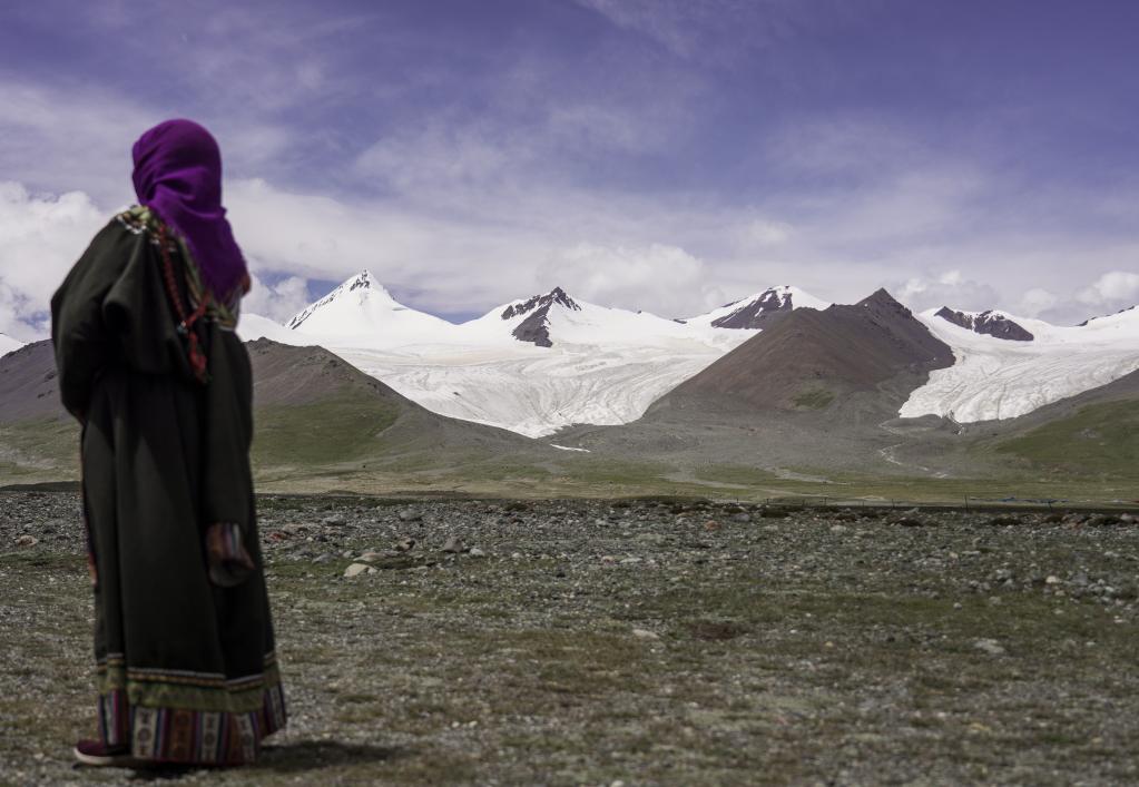 2020年8月15日,在青海省玉树藏族自治州,牧民在雪山脚下远眺岗加曲巴冰川。
