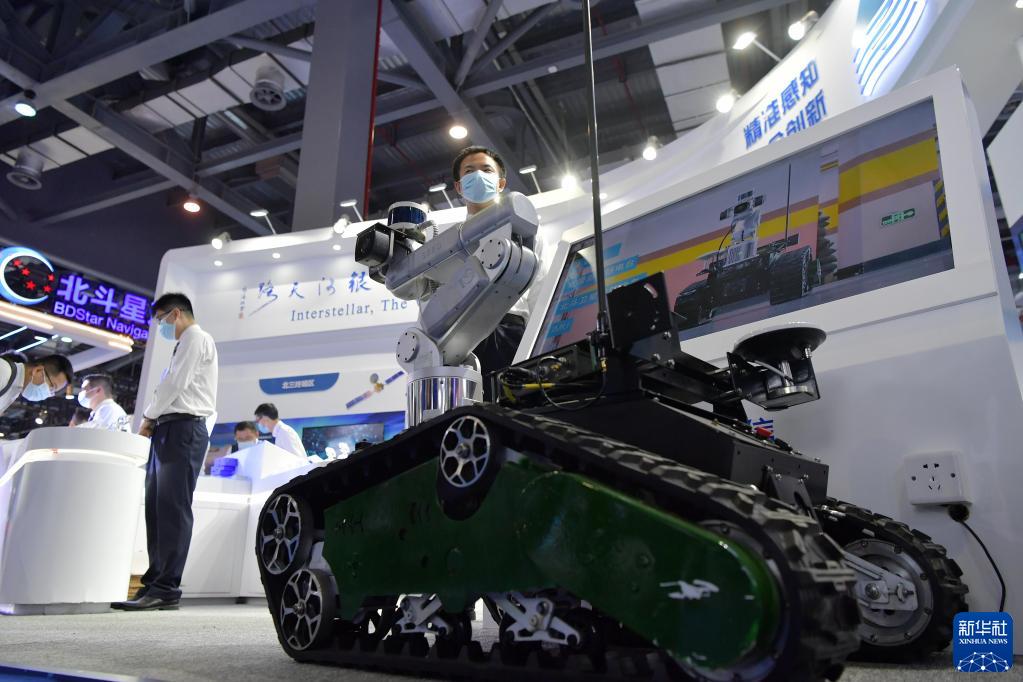 5月26日,参展商在第十二届中国卫星导航成就博览会上展示侦测无人车。