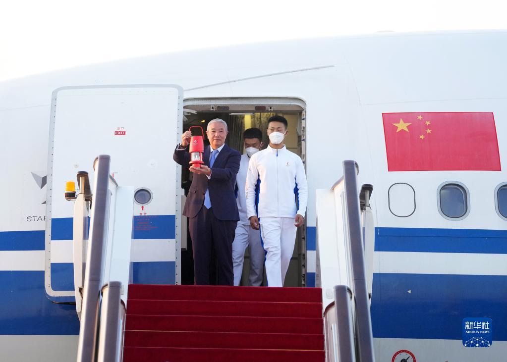 10月20日,在北京首都机场,北京冬奥组委特别代表、北京冬奥组委副主席于再清(左)手持火种灯走出舱门。随着北京冬奥组委赴希腊代表团抵达首都机场,北京冬奥会火种顺利抵达北京。