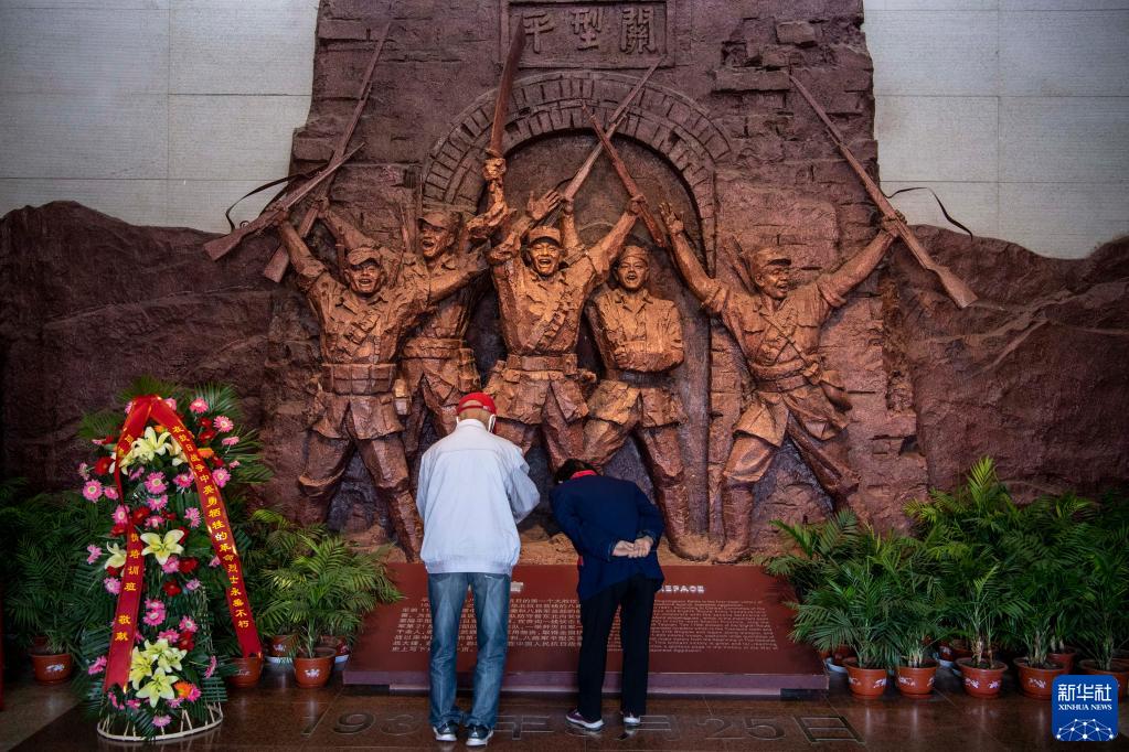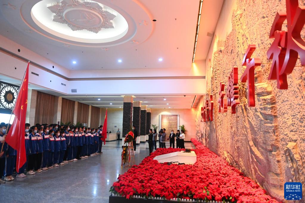 2020年9月25日,在位于山西省大同市灵丘县的平型关大捷纪念馆,工作人员向革命先烈献花。