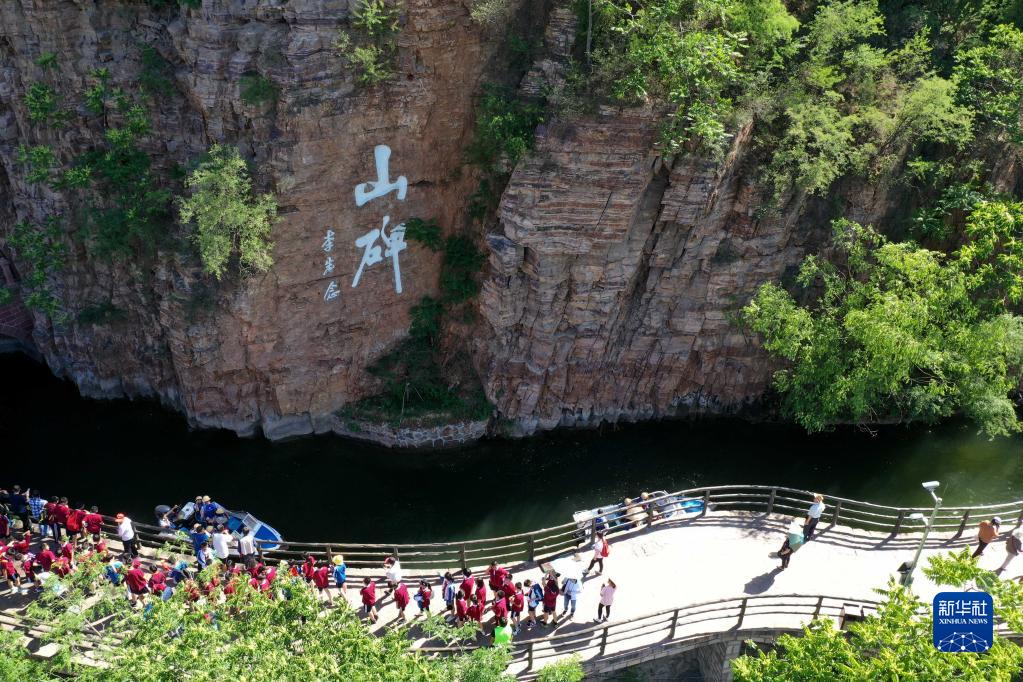 游客在河南林州红旗渠畔参观(2019年5月22日摄,无人机照片)。
