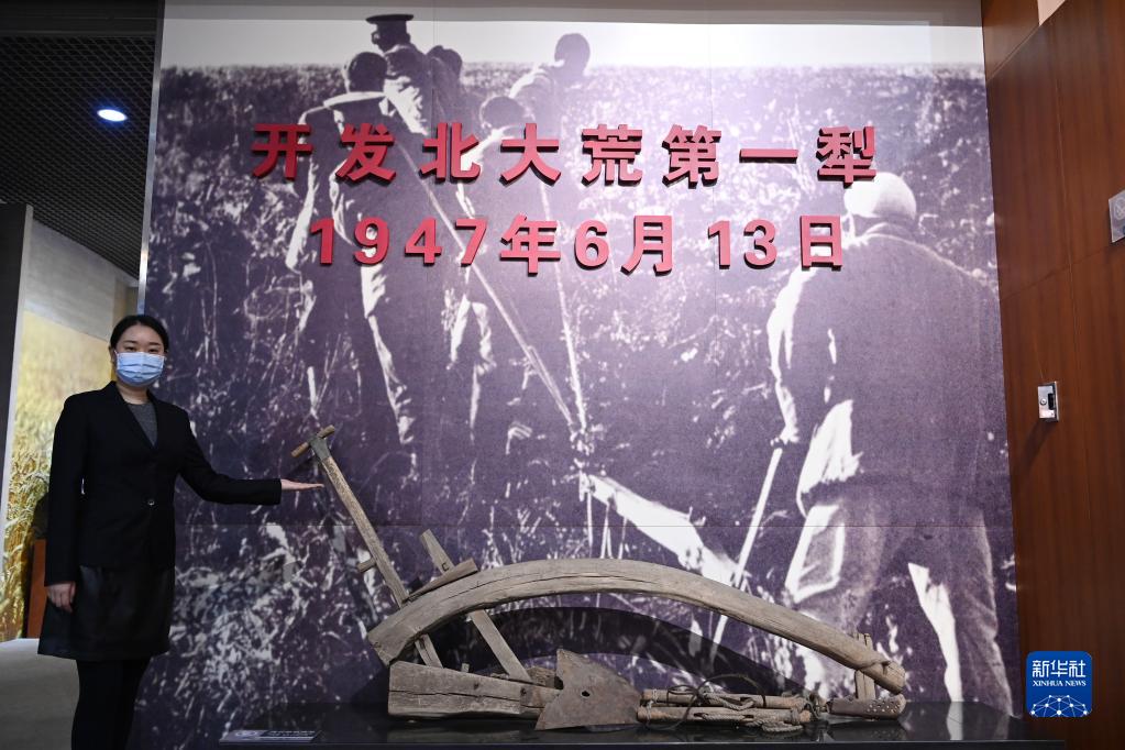在北大荒博物馆,工作人员介绍开发北大荒第一犁的历史(2021年3月10日摄)。