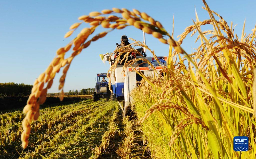 在黑龙江垦区一块稻田中,收割机在收获水稻(2011年9月24日摄)。