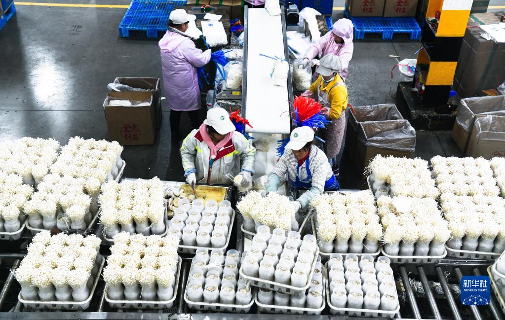 工人在位于贵州威宁经济开发区一家生物科技有限公司生产车间包装金针菇(11月28日摄)。