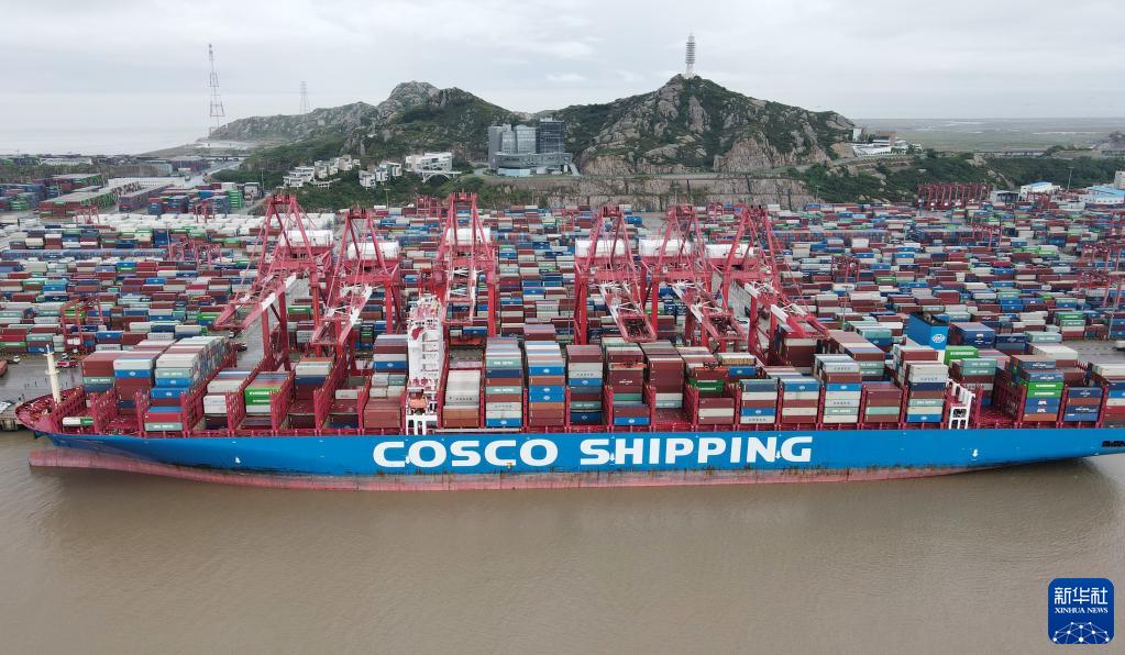 中远海运“天秤座”轮停泊在上海洋山港二期码头(10月13日摄,无人机照片)。