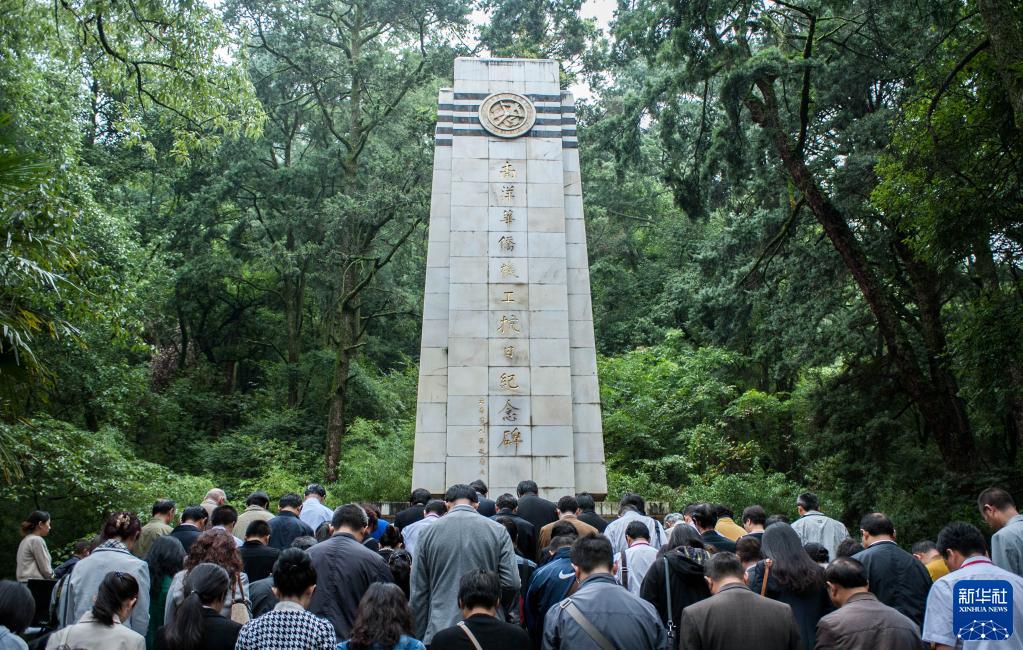 参加南洋华侨机工抗日纪念碑瞻仰活动的全体人员在云南省昆明市西山森林公园的南洋华侨机工抗日纪念碑前默哀(2015年9月8日摄)。