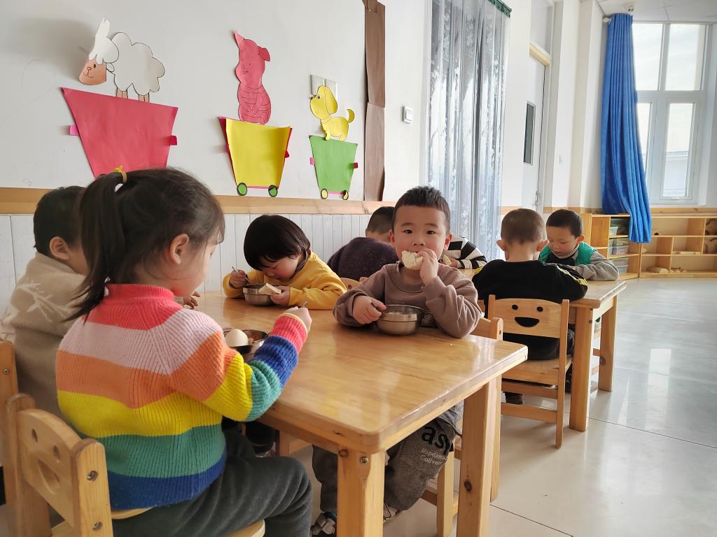 安置区配建的幼儿园里,小朋友们在吃饭。