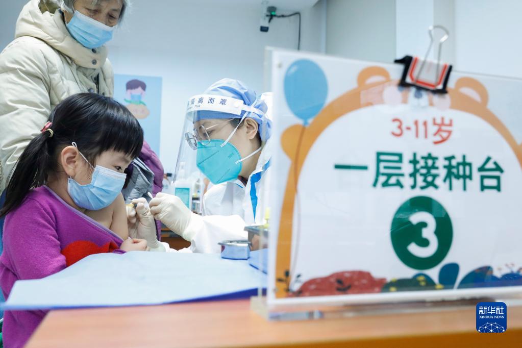 家长带着孩子在北京新街口街道新冠疫苗接种点接种疫苗(12月9日摄)。
