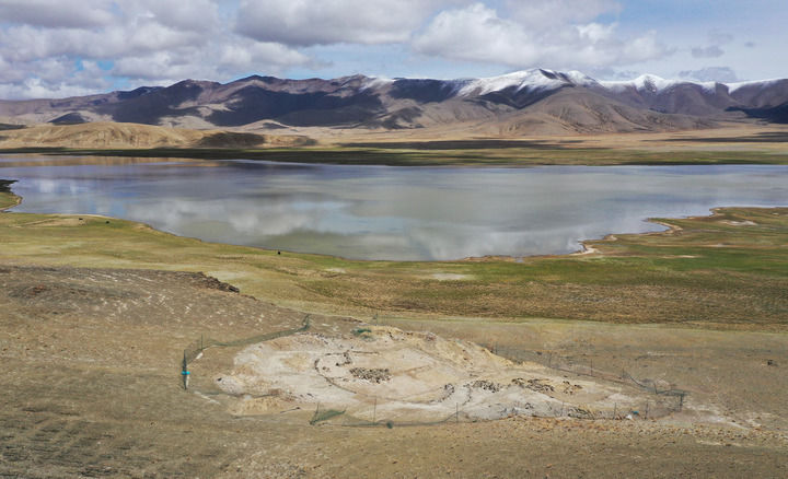 坐落在玛不错湖畔的遗址第四期石构地面建筑考古发掘现场。
