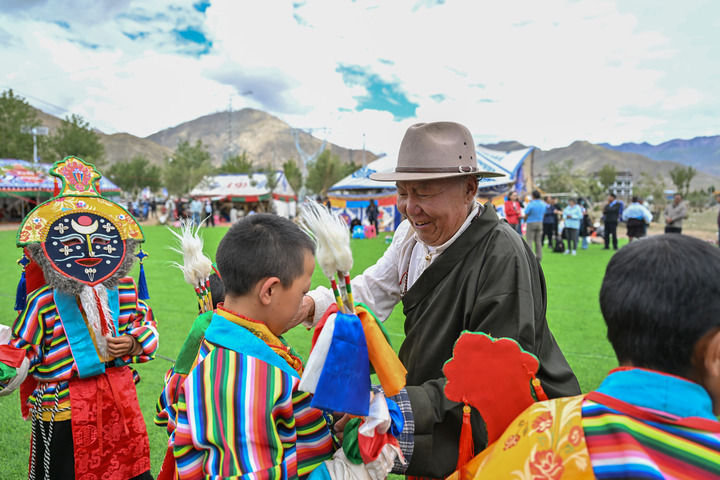 76岁的湘巴藏戏国家级非遗传承人次仁多吉(右二)在西藏南木林县非遗公园内给即将表演湘巴藏戏的小演员整理服装。
