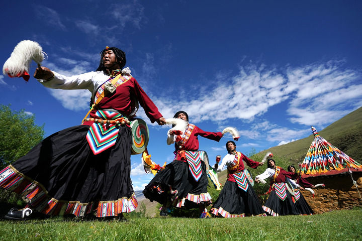在西藏山南市琼结县,久河村卓舞队的队员在表演国家级非遗项目“久河卓舞”。