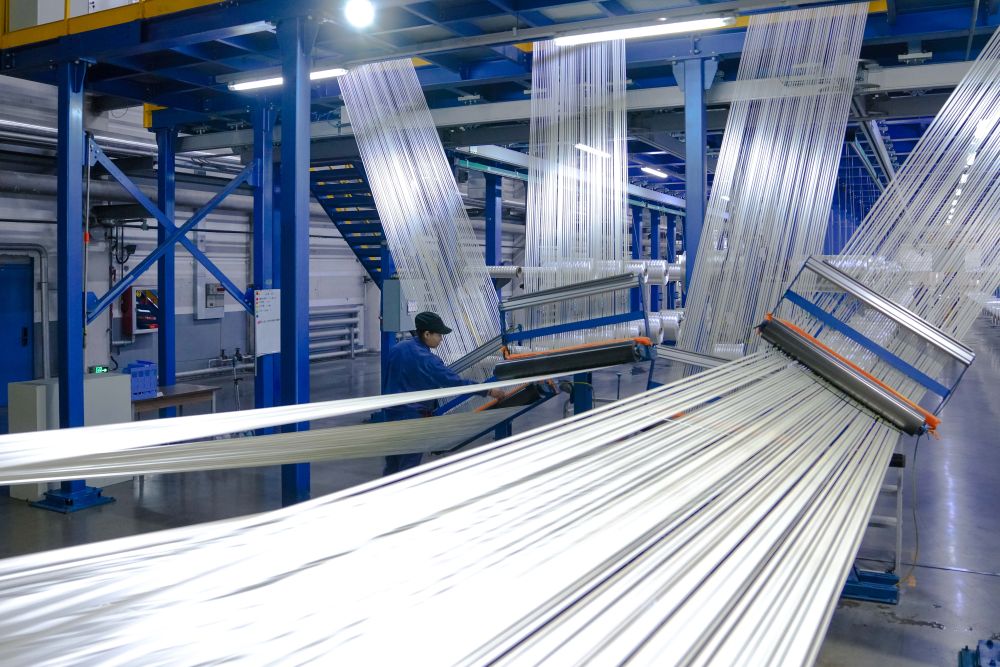 工人在吉林化纤集团国兴碳纤维有限公司碳化二车间整理碳纤维原丝。新春伊始,吉林化纤集团国兴碳纤维有限公司开足马力忙生产、赶订单。