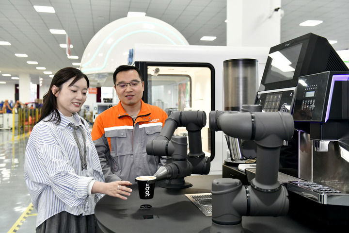 在遨博(山东)智能机器人有限公司,咖啡机器人在为参观者制作咖啡。