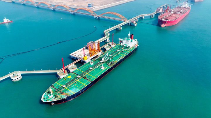 在山东港口日照港岚山港区30万吨级油品码头,船舶停靠进行卸油作业。