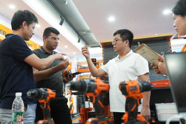 在义乌国际商贸城,商户向突尼斯客商介绍一款电钻。