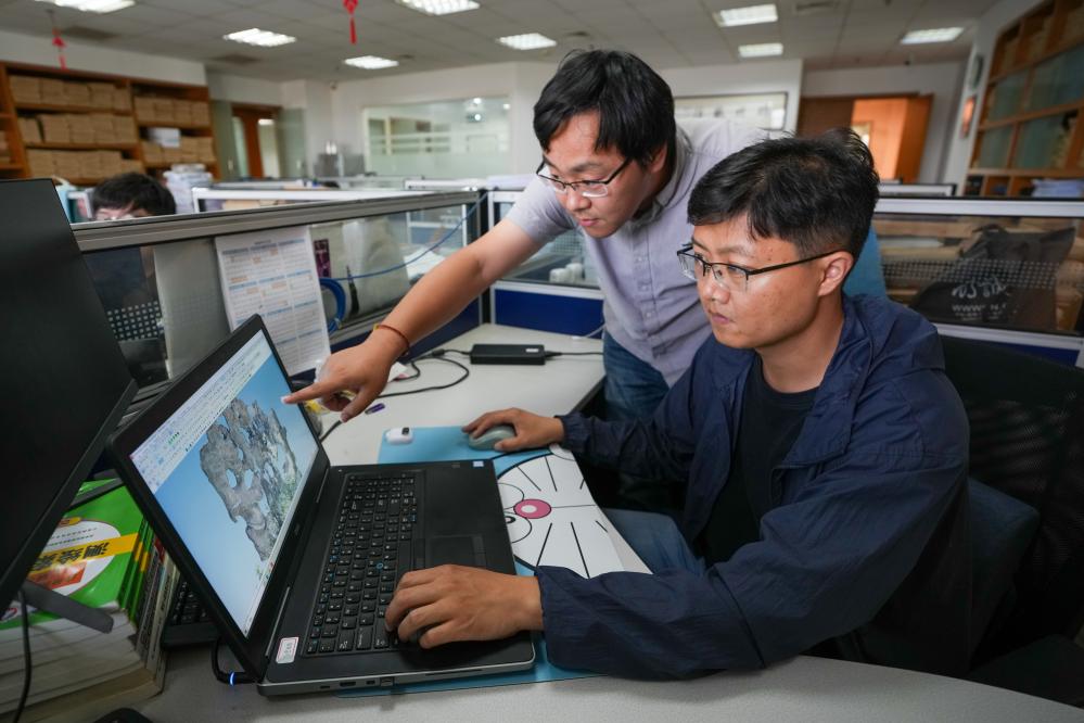 工作人员通过软件处理苏州环秀山庄的数字场景扫描数据。