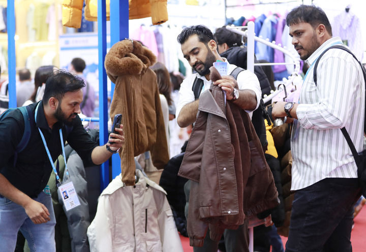 在广州开幕的第137届广交会第三期上,境外采购商在一家服装企业的展区拍摄样品。