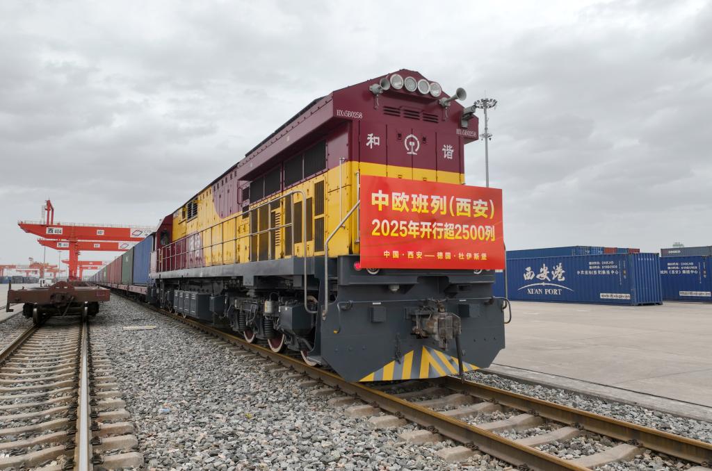 满载着汽车、机械配件、家用电器等货物的X8489次中欧班列准备开往德国杜伊斯堡,标志着中欧班列(西安)今年以来开行超2500列。