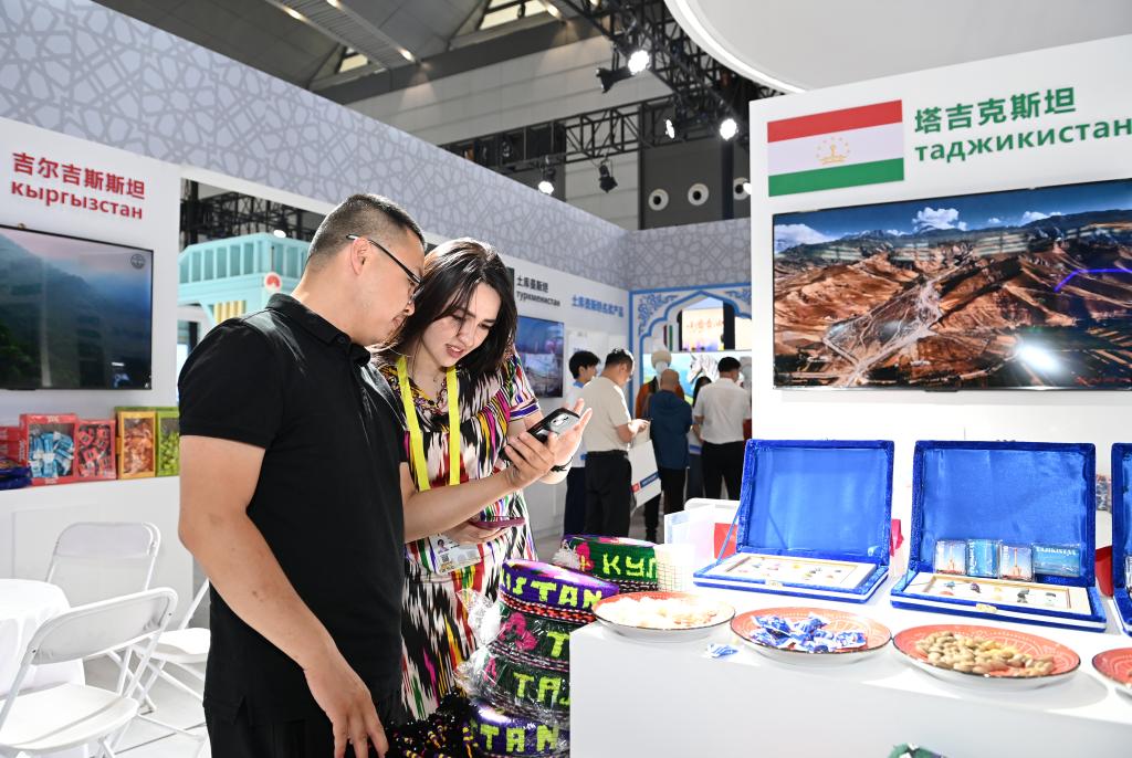 在第九届丝绸之路国际博览会暨中国东西部合作与投资贸易洽谈会丝路优品展上,参观者了解塔吉克斯坦商品。