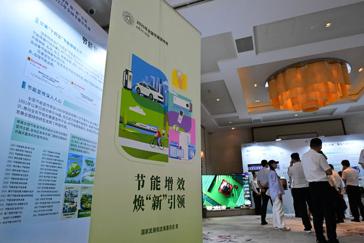 2025年全国节能宣传周在山东青岛启动,人们在节能降碳展上参观。