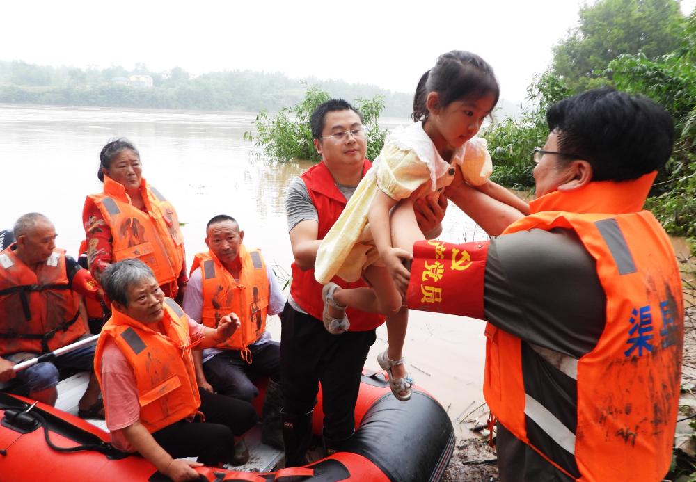 在四川省达州市渠县李渡镇灯台社区,党员干部志愿者在洪水中转移被困村民。