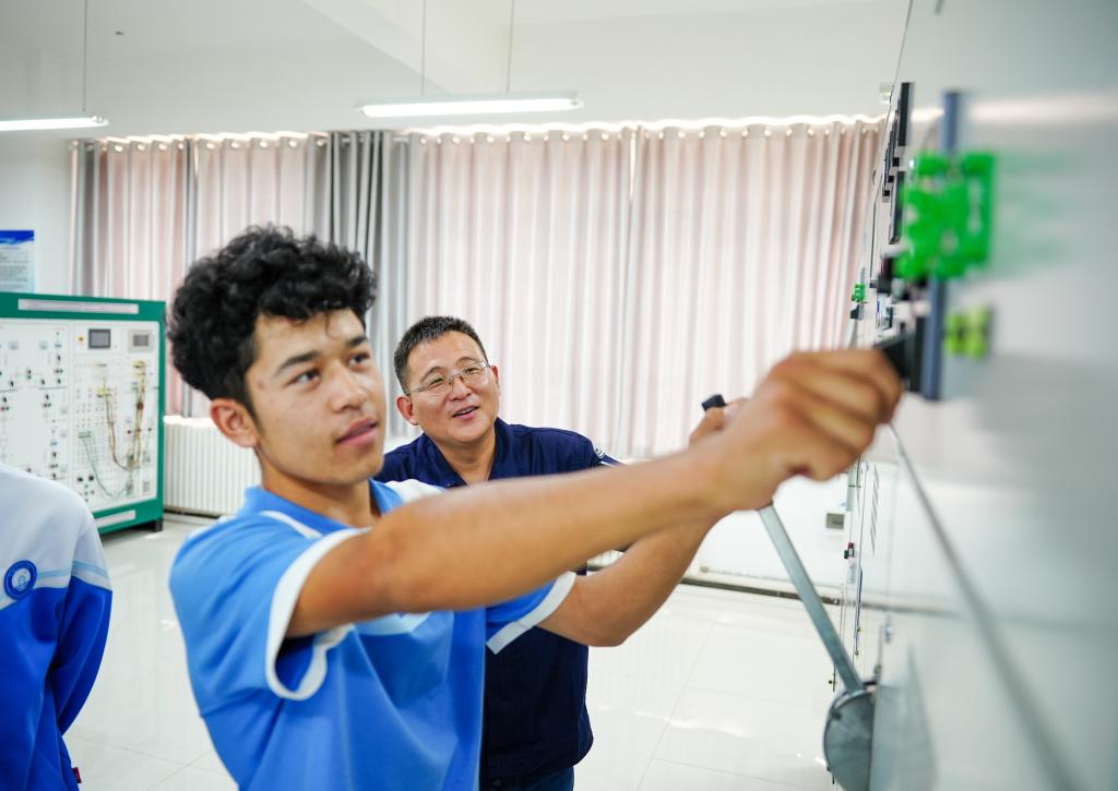 在新疆和田技师学院,北京援疆教师李东军(右)指导学生操作高压变配电设备。