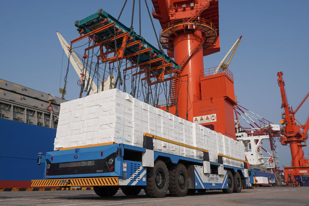 在山东青岛港件杂货全流程自动化码头,无人车在运载货物。