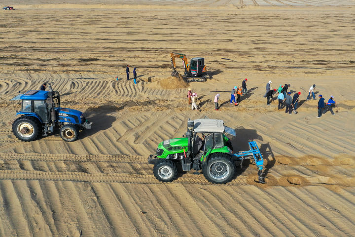 工作人员在新疆巴音郭楞蒙古自治州且末县唐农万物(且末)生态科技试验基地种植苗木。