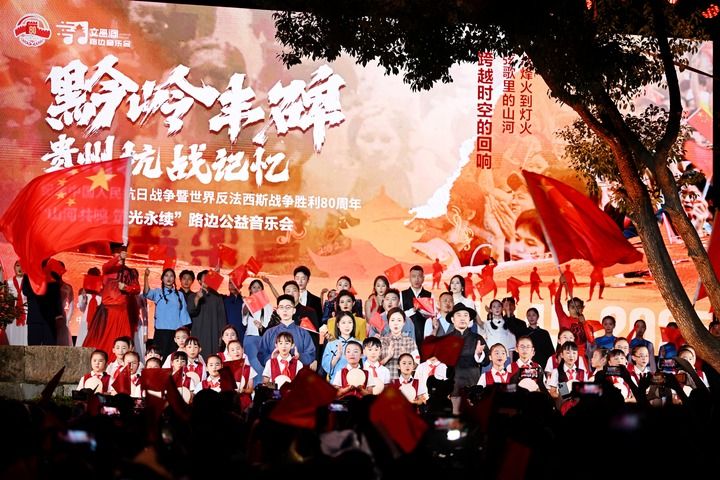 这是在贵阳市云岩区文昌阁日晷广场举办的主题为“黔岭丰碑 贵州抗战记忆”的路边公益音乐会。