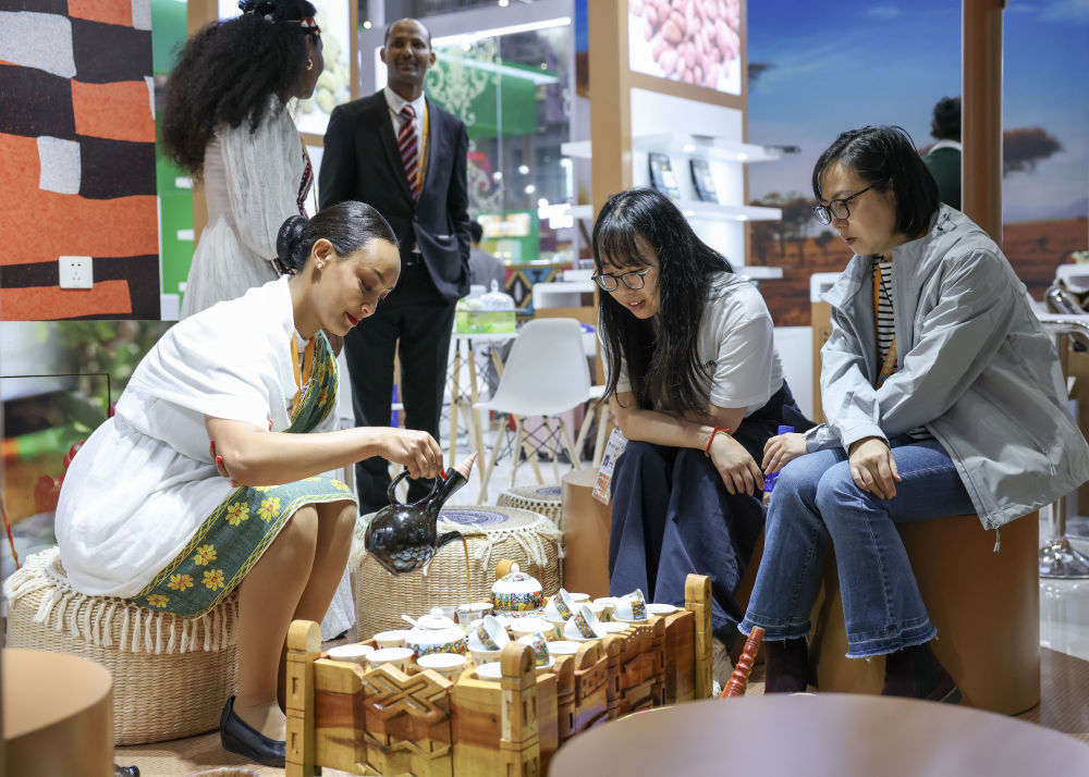 人们在第八届进博会国家展埃塞俄比亚馆品尝咖啡。