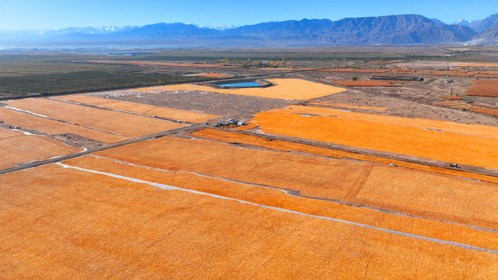 在甘肃省张掖市甘州区一处荒滩拍摄的玉米种子晒场。