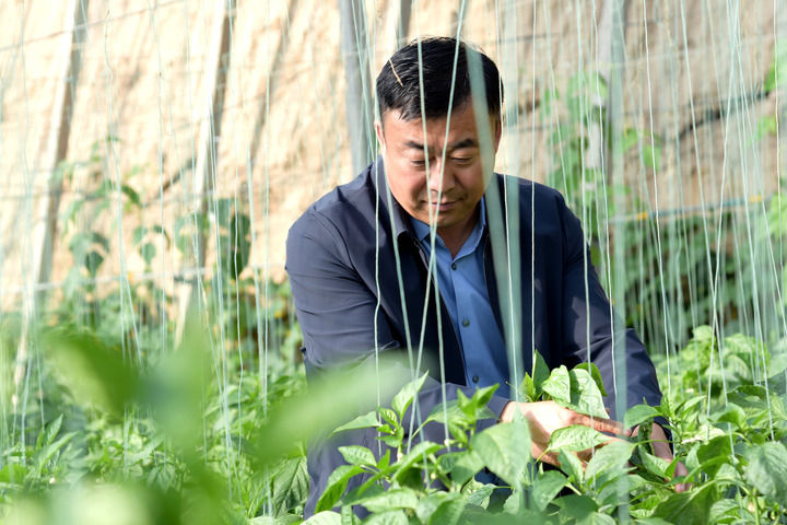 在甘肃省张掖市甘州区党寨镇马站村有机蔬菜园,马兆存在查看辣椒长势。