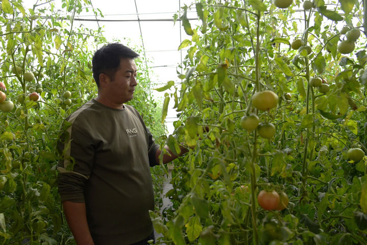 甘肃省酒泉市肃州区金佛寺镇上三截村村民李军国在查看番茄长势。