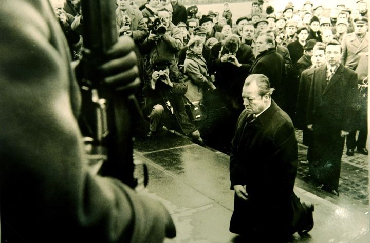 联邦德国总理勃兰特在波兰首都华沙犹太人殉难纪念碑前下跪。