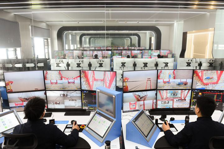 在宁波舟山港梅山港区远控桥吊操作中心,远控桥吊司机对现场船舶进行远程装卸作业。