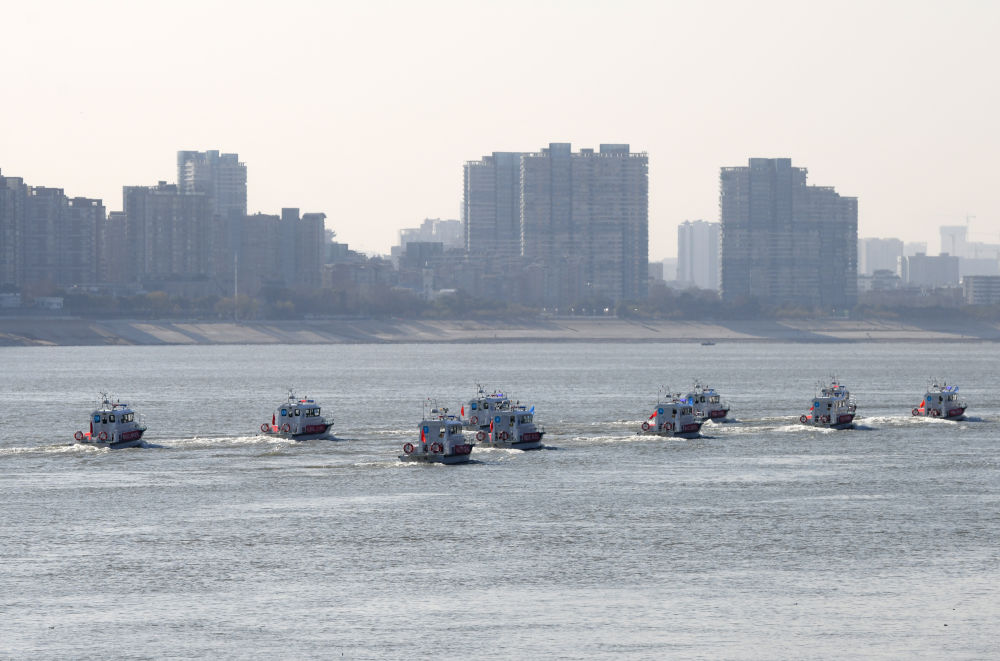 渔政执法船队从长江武汉段江面驶过。
