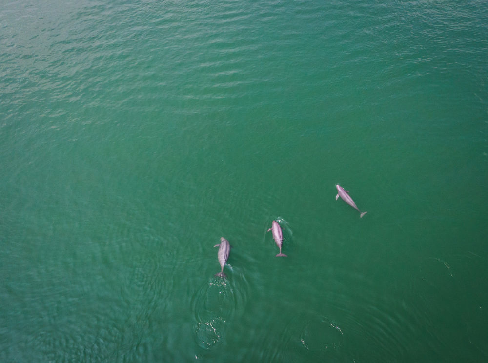 在湖北省宜昌市,长江江豚在水中嬉戏。