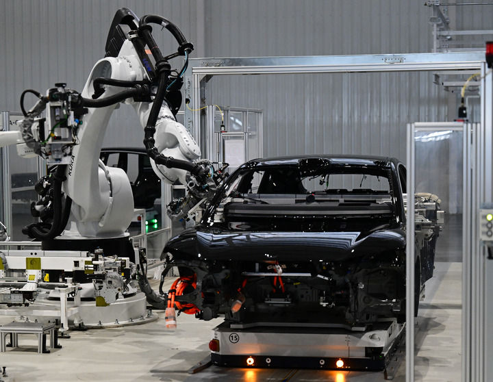 在合肥市新桥智能电动汽车产业园蔚来第二工厂拍摄的新能源汽车生产线。