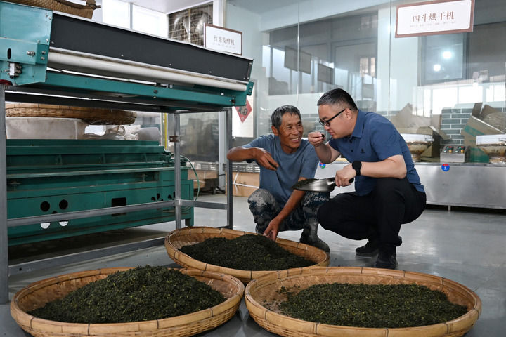 在山东省日照市五莲县丁家楼子村,第一书记郑勇山(右)在村里的茶叶合作社查看茶叶品质。
