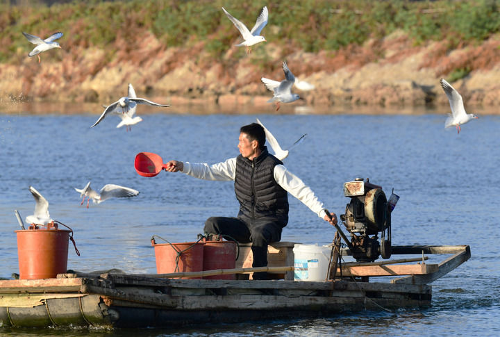 福建省漳州市佛昙镇东坂村河豚养殖户在给河豚投喂食物。