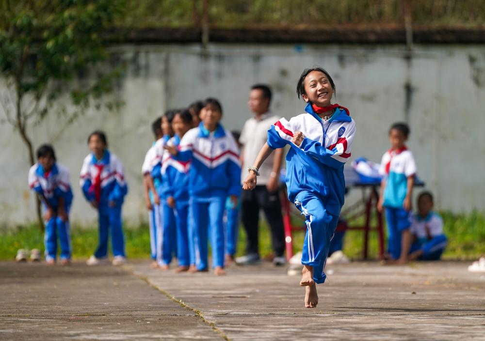 在云南省普洱市孟连傣族拉祜族佤族自治县,腊福小学学生课间在操场进行奔跑接力比赛。