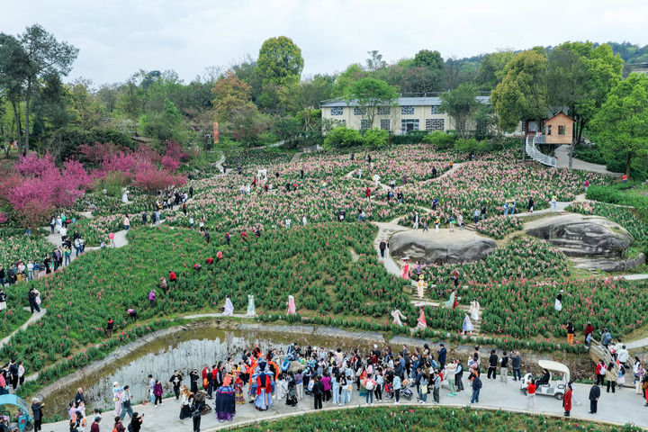 游客在重庆市巴南区二圣镇集体村云林天乡景区踏青游玩。近年来,重庆市巴南区二圣镇集体村依托云林天乡景区,发展都市休闲观光农业,深入推进农文旅深度融合发展,通过打造油菜花、金鱼草等不同品种的四季高山花海主题景区,实现从过去苗木基地“卖苗木”到乡村旅游“卖景观”的转变,带动村民增收致富。