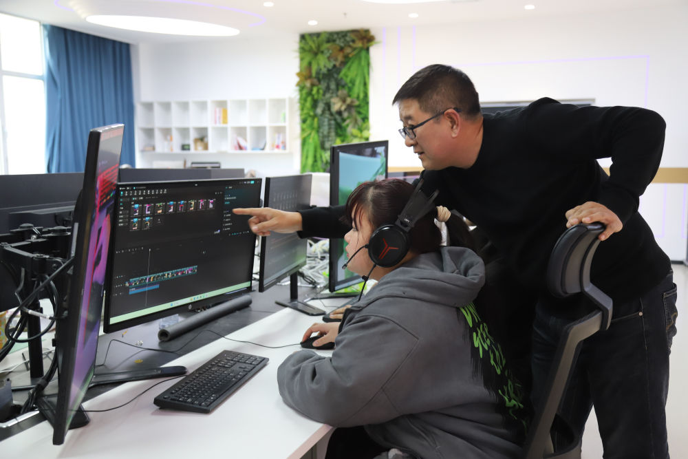 河北软件职业技术学院教师指导泰国留学生进行电脑实操。