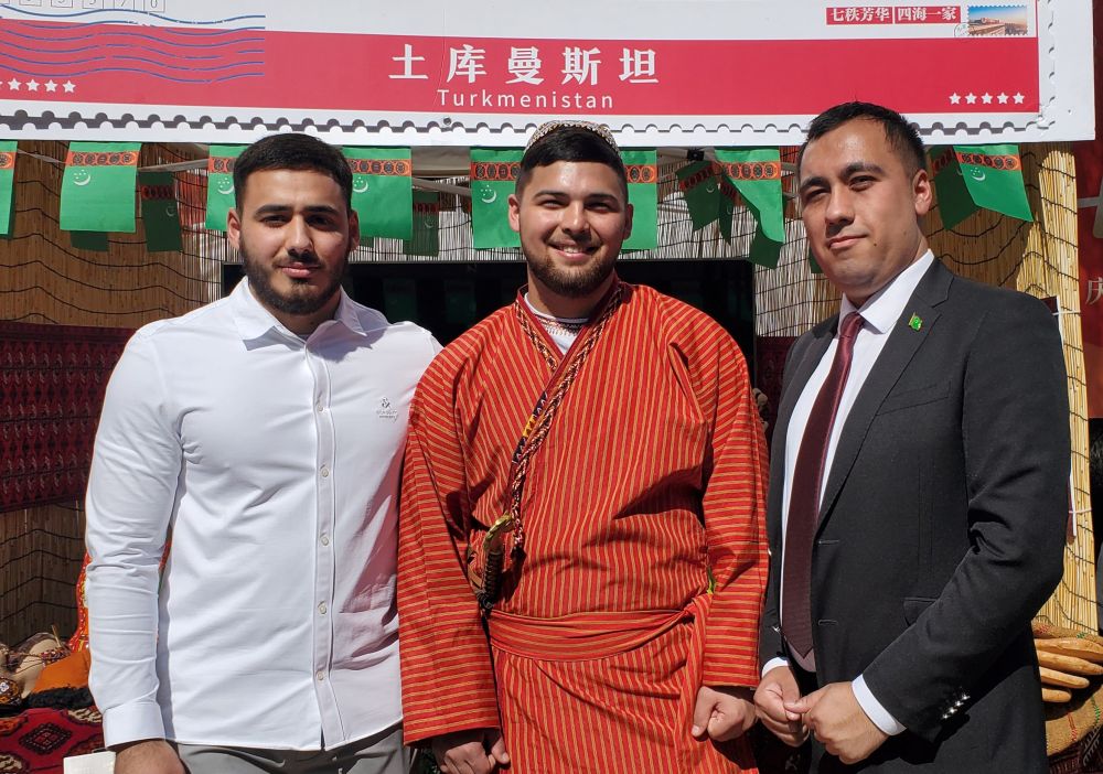 在中国石油大学(北京)第七届国际文化节上,土库曼斯坦留学生若贺曼(右一)与同学们在土库曼斯坦展台前合影留念。