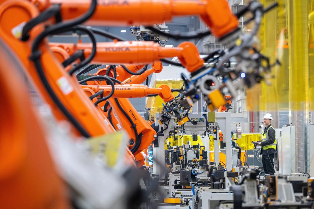 在浙江省湖州市长兴县吕山乡,诺力五期未来工厂的工人在智能化生产线上工作。