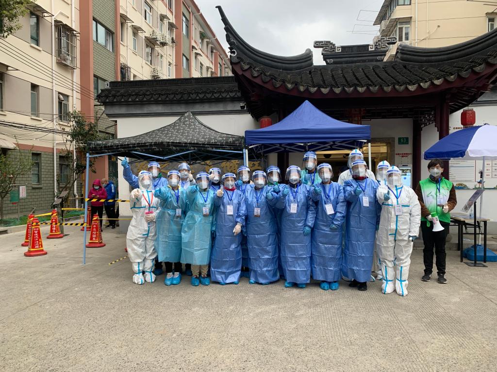虹储居民区核酸检测采样点,党员干部、医务工作者以及来自各行各业的志愿者共同抗疫。