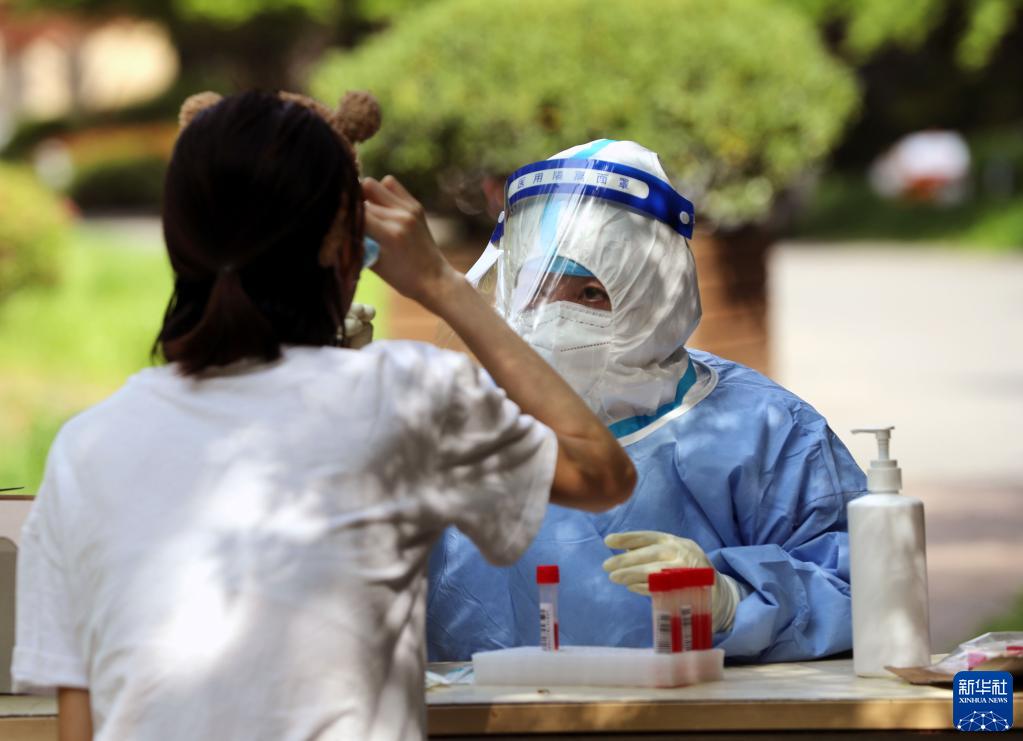 4月12日,在上海松江区一居民小区内,医务人员进行核酸检测采样。
